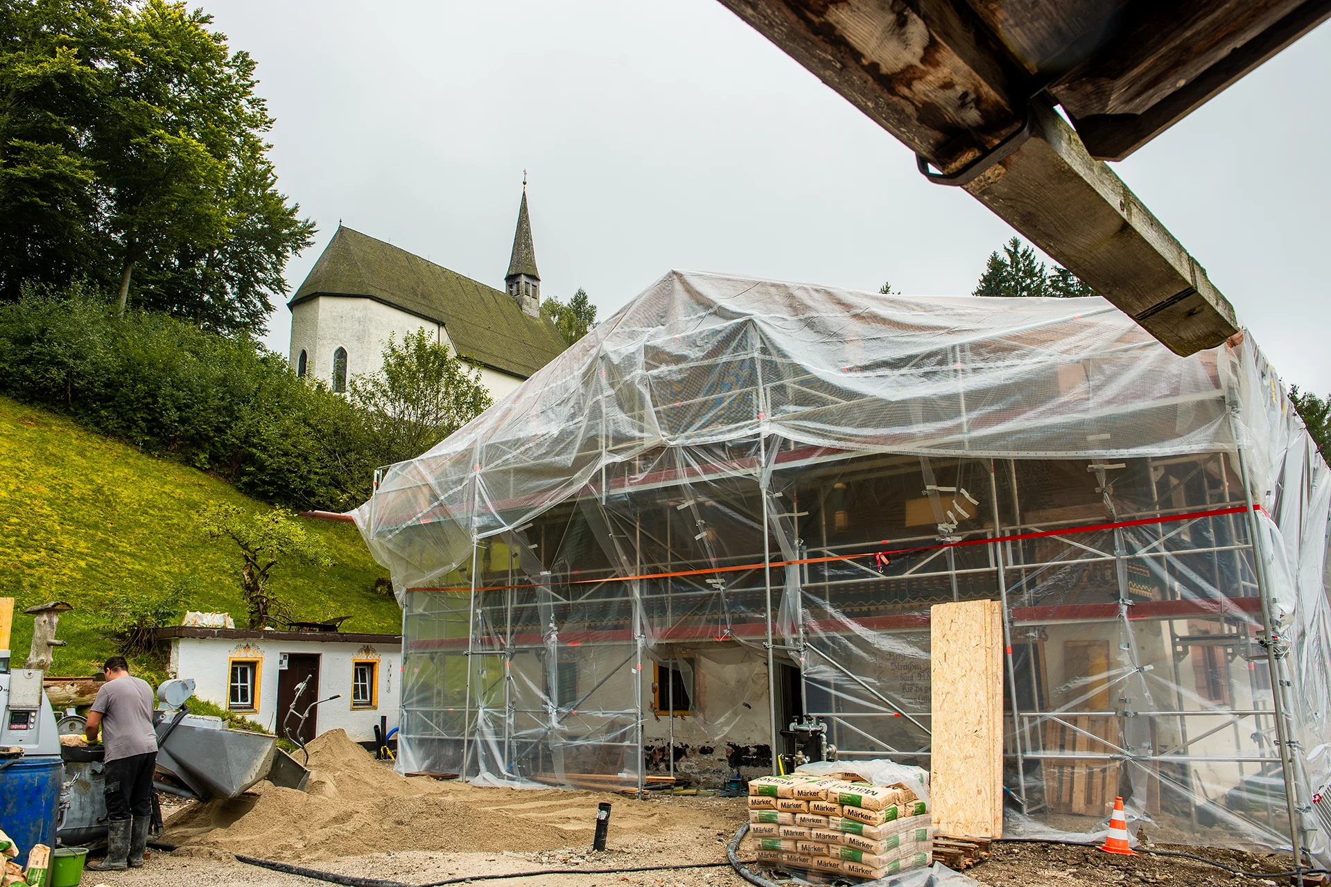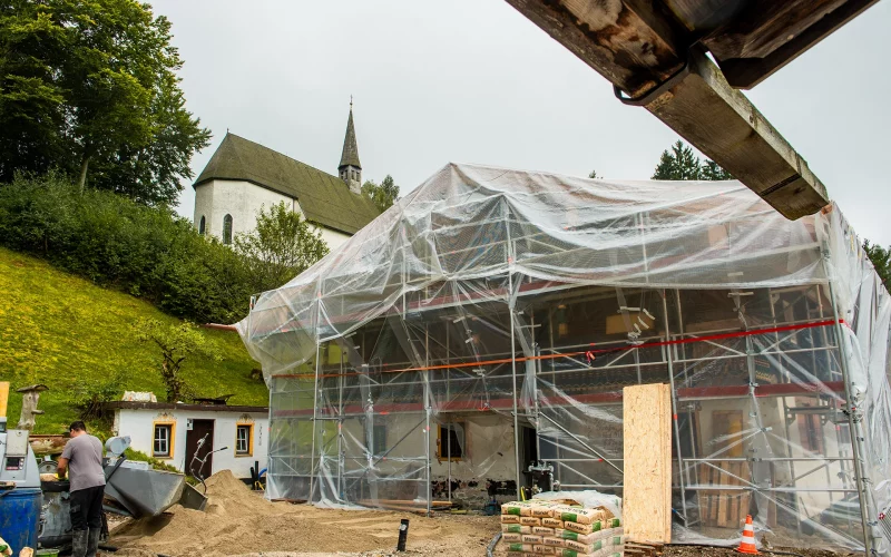 Mit dem Ziel, den einzigartigen Wert dieses historischen Ortes zu bewahren und diesen für die kommenden Generationen wieder erlebbar zu machen, startete die Stiftung Kulturerbe Bayern die Instandsetzung des Gebäudes. Den Berggasthof technisch und energetisch auf den neuesten Stand zu bringen und zugleich behutsam in seiner historischen Substanz zu erhalten, waren die Herausforderungen bei diesem Projekt. Den barocken Originalanstrich der Fassade konnten die Handwerkerinnen sowie Handwerker wieder freilegen – und dieser bestimmt nun die Neufassung: „Sofern das Wetter mitspielt und wir keinen allzu schneereichen Winter bekommen, sollte es mit der Neueröffnung im Frühjahr 2026 klappen“, freut sich Ursula Scriba, Vorsitzende des Vorstands der Stiftung Kulturerbe Bayern.