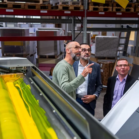Auf diese Weise kam doch noch ein Geschäft zustande, das eigentlich längst gescheitert schien – denn ursprünglich plante Ralf Vogl schon 2019 den Erwerb einer fabrikneuen Druckmaschine der Marke Heidelberger. 3,5 Millionen Euro hätte diese Anschaffung gekostet. Der Kaufvertrag einschließlich Finanzierung durch die Kreissparkasse München Starnberg Ebersberg stand bereits mit allen Details, doch dann machte die Corona-Krise einen Strich durch die Rechnung: Die Umsätze begannen zusehends einzubrechen, Ralf Vogl machte im letzten Moment einen Rückzieher und stornierte den Vertrag fristgerecht. „Wir sind damals aus allen Wolken gefallen“, sagte René Wutke, „die ganze Vorarbeit umsonst! Heute wissen wir es natürlich besser.“