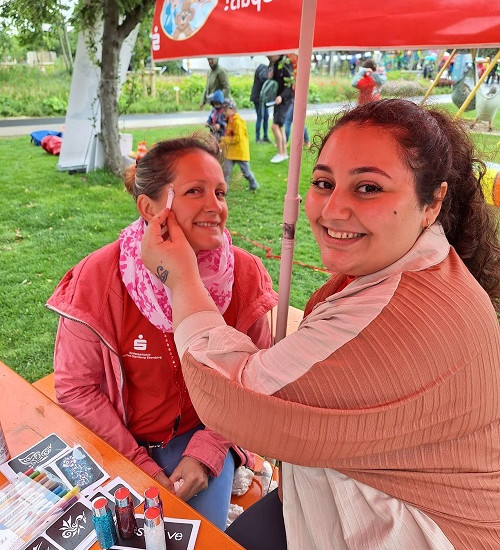 Für die kleinen Ratefüchse, Rennmäuse und Bastelfans hatte die Kreissparkasse verschiedene Spielstationen eingerichtet. Klassiker blieben das Torwandschießen, Dosenwerfen, Sackhüpfen, der Geschicklichkeitsparcours oder das Bobbycar-Rennen. Mitarbeiterinnen und Mitarbeiter der Kreissparkasse betreuten diese mit viel Freude. Bei sich stetig besserndem Wetter konnten alle kleinen Gäste trockenen Fußes die Spiele absolvieren, die Bastelstation besuchen oder sich Tattoos schminken lassen sowie am Glücksrad ihr Glück versuchen.
