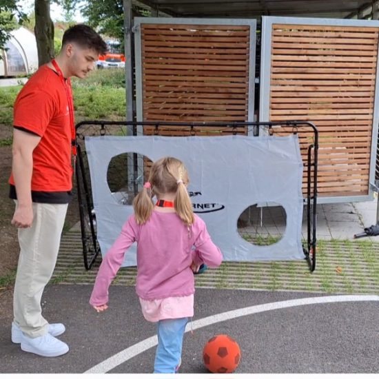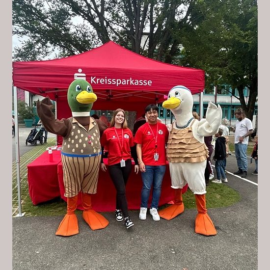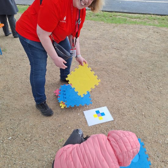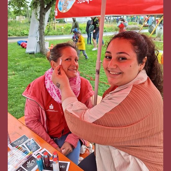 Für die kleinen Ratefüchse, Rennmäuse und Bastelfans hatte die Kreissparkasse verschiedene Spielstationen eingerichtet. Klassiker blieben das Torwandschießen, Dosenwerfen, Sackhüpfen, der Geschicklichkeitsparcours oder das Bobbycar-Rennen. Mitarbeiterinnen und Mitarbeiter der Kreissparkasse betreuten diese mit viel Freude. Bei sich stetig besserndem Wetter konnten alle kleinen Gäste trockenen Fußes die Spiele absolvieren, die Bastelstation besuchen oder sich Tattoos schminken lassen sowie am Glücksrad ihr Glück versuchen.