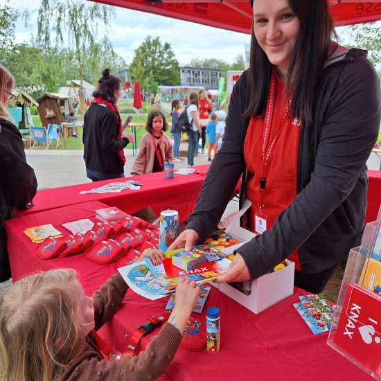 Auch Andrea Felsner-Peifer aus dem Vorstand der Kreissparkasse unterstützte wie schon letztes Jahr tatkräftig das Team vor Ort und erklärte: „Das Knax-Kinderfest ist mit ein Höhepunkt im Sparkassen-Terminkalender. Generationen sind mit der Knax-Welt der Sparkasse aufgewachsen und ich freue mich ganz besonders, dass wir im 50. Jubiläumsjahr hier in diesem besonderen Rahmen der Landesgartenschau feiern dürfen.“