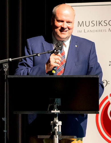 Launig und eloquent führte als Moderator Jonas Frank durchs Programm. Der 23-jährige Entertainer und mehrfache Bandleader sowie Multiinstrumentalist ist über die bayerischen Grenzen hinaus als Moderator und Musiker unterwegs. Bereits zum zweiten Mal nach 2022 begleitete Jonas Frank den Musikschulpreis und erhielt am Ende des Nachmittags noch ein extra Lob vom Stiftungsvorstandsvorsitzenden Landrat Christoph Göbel.